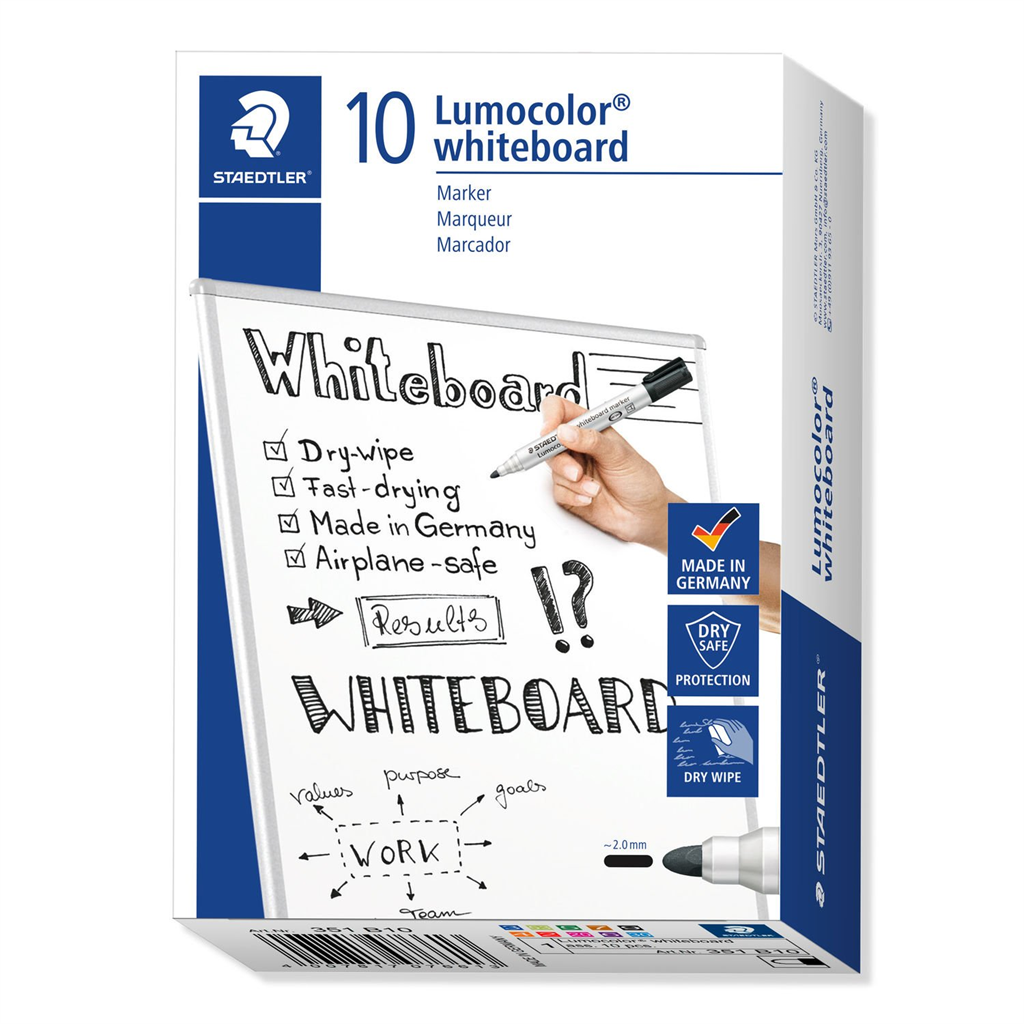 Ten count box containing 10 Lumocolor whiteboard marker in assorted colours