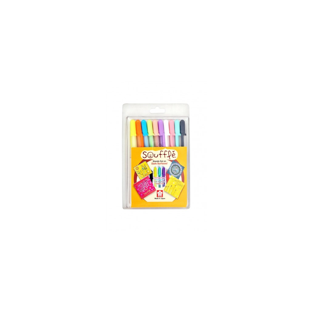 The soft color and raised line of Soufflé® adds vibrant detail and dimension to art and craft projects. Three-dimensional (#D) ink leaves a raised ink line for writing you can feel. Soufflé pens color on plastic, coated paper, acetate, vellum and glass.