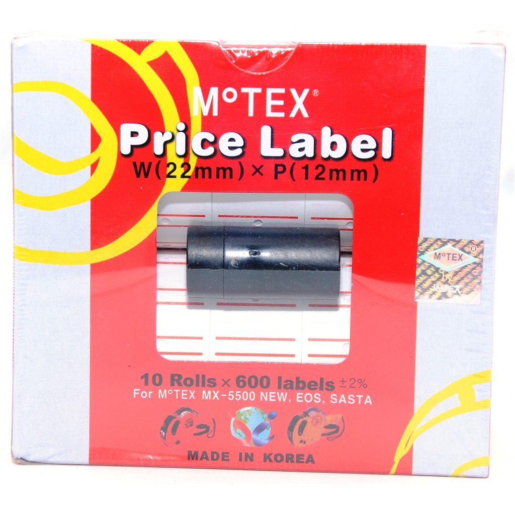 • FOR MACHINE MX-5500 Single line labelling Machine Available in 8 digits Available in 5 attractive colors Customised layouts are available Label size : 22mm x 12mm Best selling labeller in the world Clean and accurate printing One touch open system Contains 1 pre inserted Label Roll and 1 Spare Ink Roller Made in Korea FOR LABEL MX5500 Suitable for Motex 5500 Labeller Color: WHITE 10 Rolls x 600 Labels # 1 Quality Made in Korea
